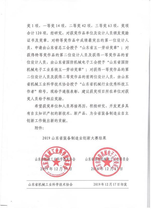 公司榮獲山東省裝備制造業(yè)創(chuàng)新大賽二等獎